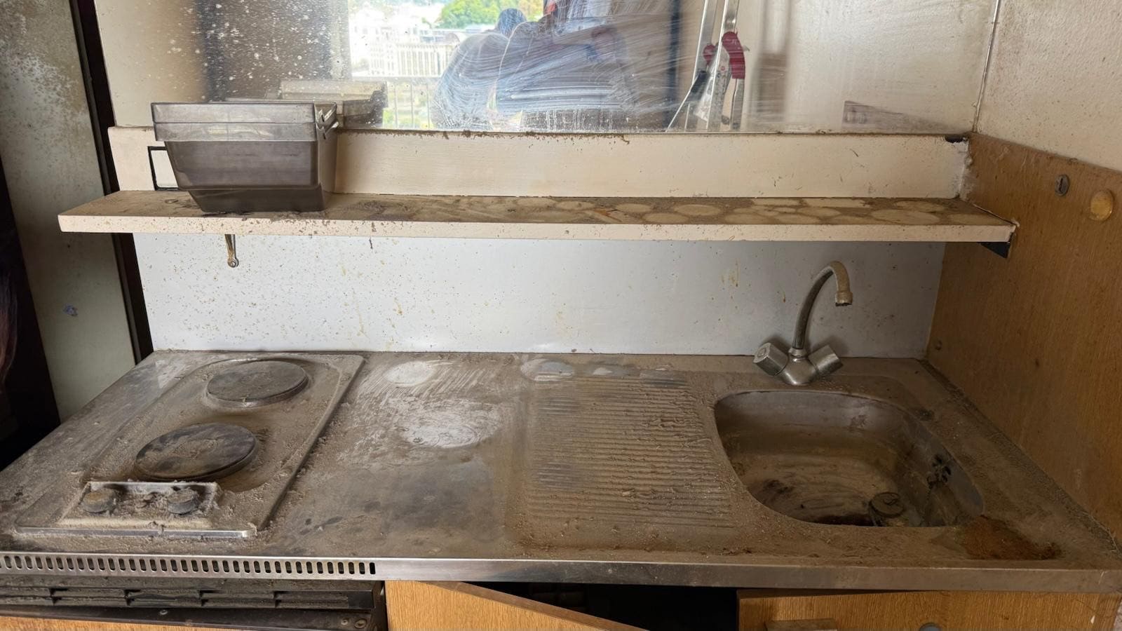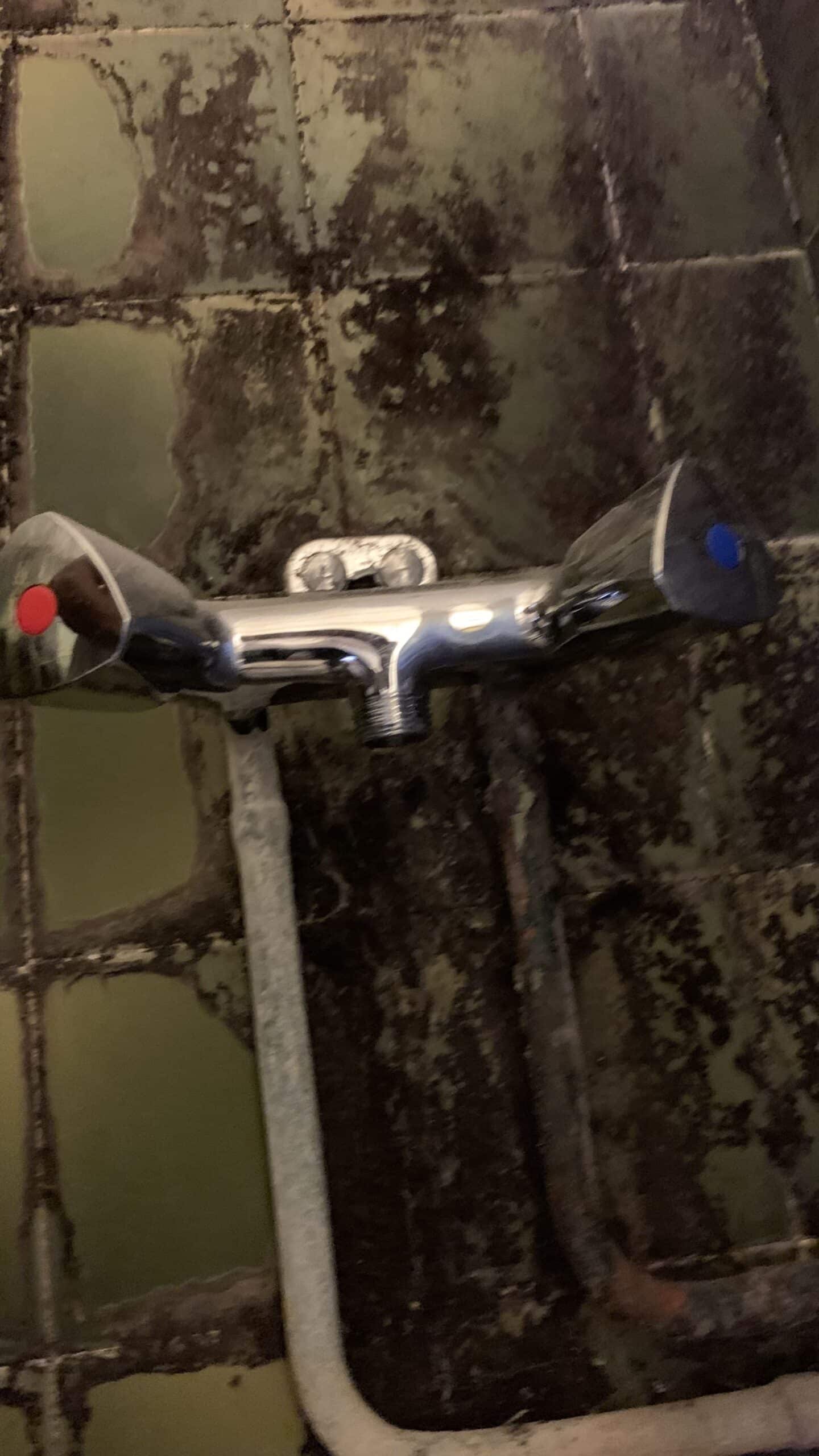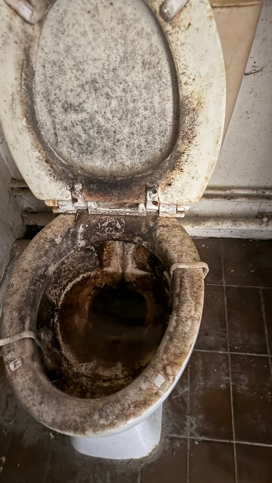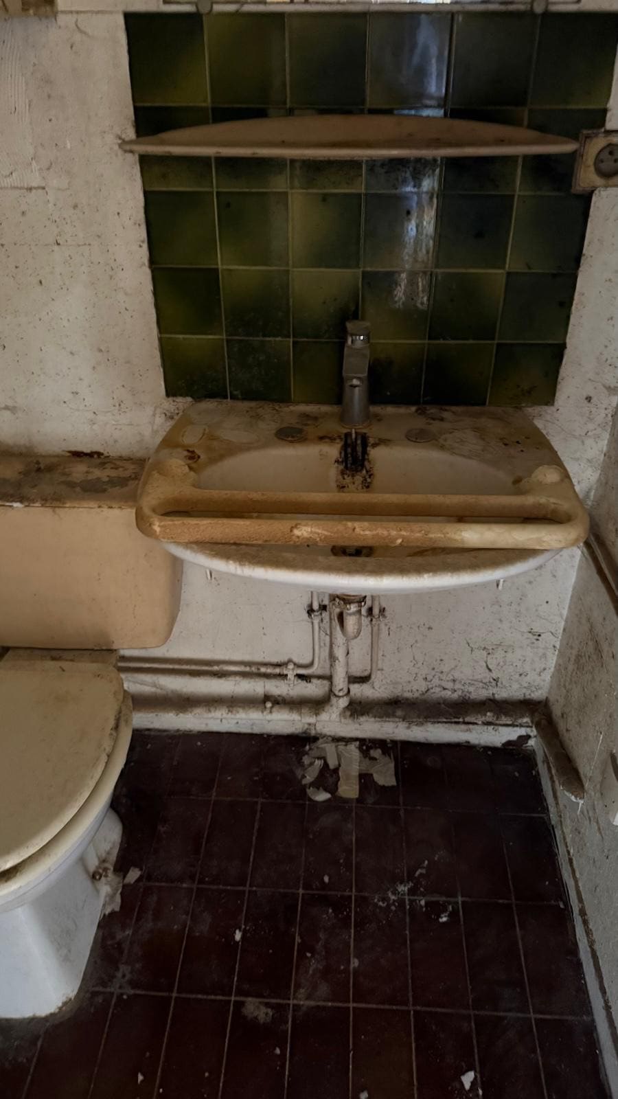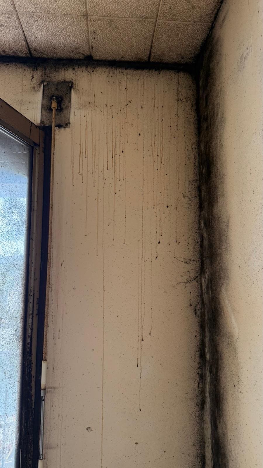 peinture jaunie, moisissures sur les murs, fuites d’eau, canalisations bouchées, et terrasse envahie de dépôts noirs.